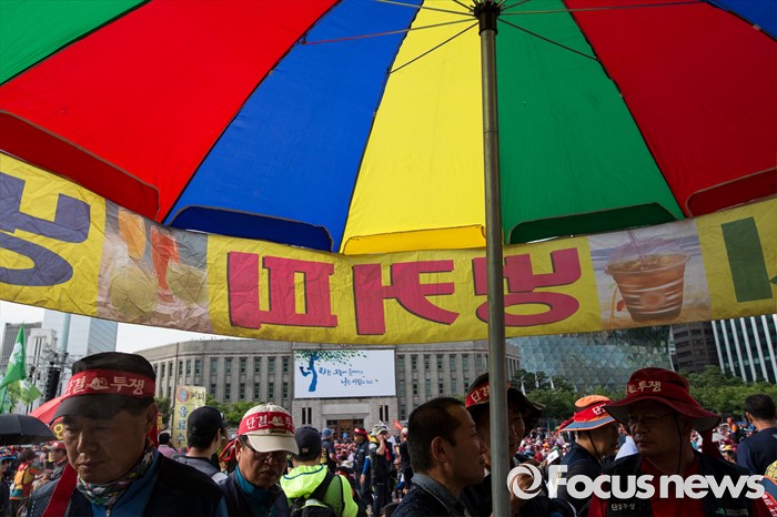 (서울=포커스뉴스) 6일 오후 서울 중구 서울시청광장에서 열린 '건설노동자 총력투쟁 결의대회'에 참석한 조합원들이 광장 인근에서 휴식을 취하고 있다.