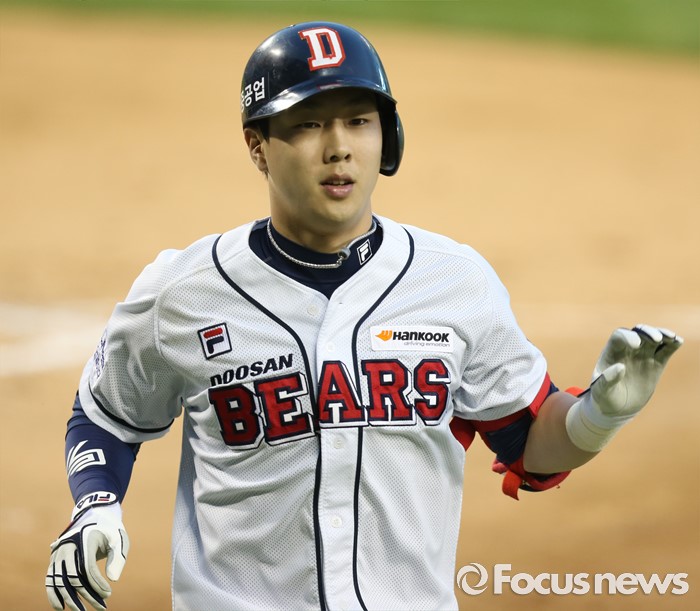 (서울=포커스뉴스) 6일 서울 잠실구장에서 열린 2016 프로야구 넥센-두산 경기 4회말 1사 1루에서 두산 박건우가 우월 2점 홈런을 치고 홈인하고 있다.