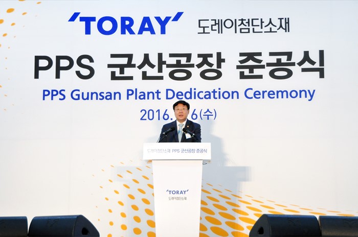 (군산=포커스뉴스) 주형환 산업통상자원부 장관이 6일 전북 군산시 새만금산업단지에 위치한 도레이 첨단소재 군산공장에서 송하진 전북도지사, 이영관 도레이첨단소재 회장, 닛카쿠 도레이본사 사장, 벳쇼코로 일본대사 및 관계자 등 300여명이 참석한 가운데 열린 도레이 첨단소재 군산공장 준공식에 참석해 축사를 하고 있다. <사진제공=산업통상자원부>