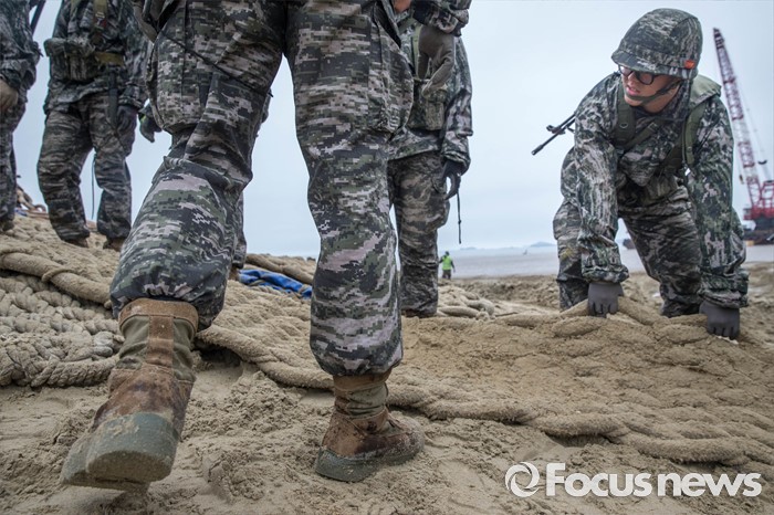 (태안=포커스뉴스) 7일 오전 충청남도 태안군 안면읍 인근 해안에서 2016 합동 해안양륙군수지원(J LOTS) 훈련이 열리고 있다. 합동참모본부 주관으로 해군과 해병대, 육군, 해경이 참가하는 합동 해안양륙군수지원 훈련은 항만 사용이 불가한 지역에서 작전을 수행중인 전투부대에 군수지운을 하기 위한 작전이다.