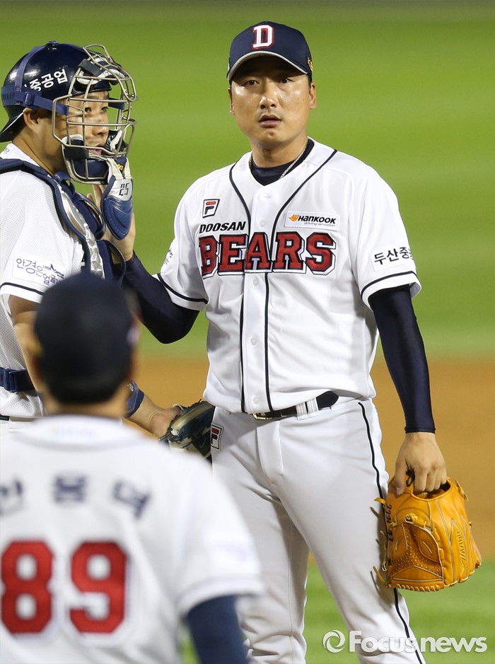 | △ 마운드 내려가는 두산 정재훈 |