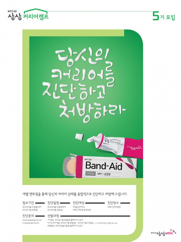 KT&G 관계자는 "'상상 커리어캠프'는 취업에 어려움을 겪는 대학생들에게 맞춤형 컨설팅을 제공하고자 그 역할을 충실히 수행해 왔다"며 "이번 프로그램을 통해 더 많은 대학생들이 원하는 분야로 진출해 자신의 꿈을 펼치기를 기대한다"고 밝혔다.'상상 커리어캠프' 5기 참가자 모집을 알리는 포스터.<사진제공=KT&G>