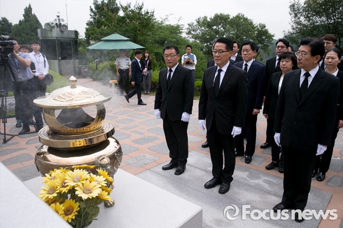 (서울=포커스뉴스) 박지원 국민의당 비상대책위원장과 비대위원 등이 7일 오전 동작구 국립서울현충원을 방문해 故 김대중 전 대통령 묘소 참배를 하고 있다.