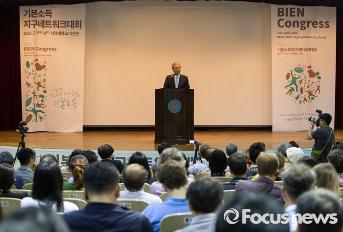 (서울=포커스뉴스) 김종인 더불어민주당 비상대책위원회 대표가 7일 오전 서울 서강대학교 다산관에서 열린 제 16차 기본소득지구네트워크 대회에서 축사를 하고 있다. 이번 16차 대회는 아시아에서는 처음 열리는 기본소득 국제 대회로 세계 23개국에서 기본소득 운동을 벌이는 활동가와 이론가들이 참석한다.