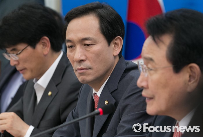 (서울=포커스뉴스) 7일 오전 서울 여의도 국회에서 열린 더불어민주당 정책조정회의에 참석한 우상호(가운데) 원내대표가 변재일(오른쪽) 정책위의장의 발언을 듣고 있다.