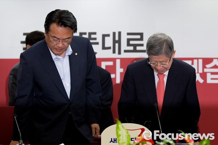 (서울=포커스뉴스) 김희옥(오른쪽) 새누리당 혁신비상대책위원장과 정진석 원내대표가 7일 오전 서울 여의도 새누리당사에서 열린 혁신비상대책위원회의에 참석하기 위해 회의실로 들어서고 있다.