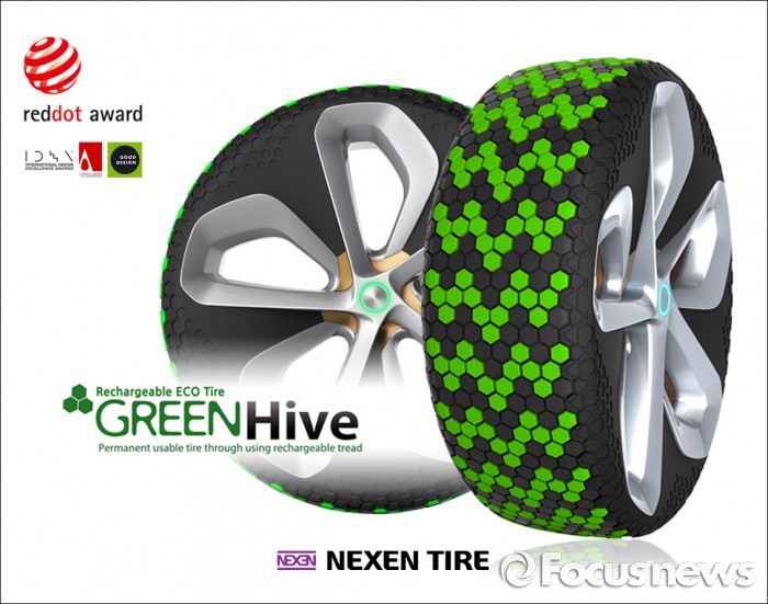 트레드 재충전식의 친환경 콘셉트타이어인 그린하이브는 미국 IDEA 디자인 어워드를 시작으로 지난해 이탈리아 A 디자인 어워드, 올해 미국 그린 굿 디자인 어워드에 이어 독일 레드닷 어워드까지 수상하며, 글로벌 디자인 어워드에서 연이은 호평을 받고 있다.