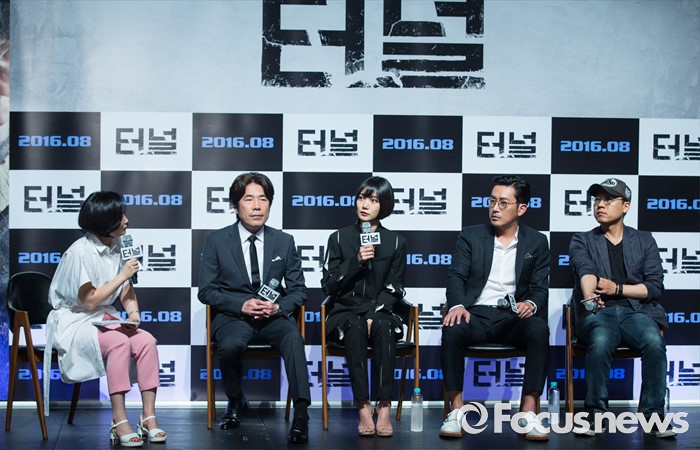 (서울=포커스뉴스) 7일 오전 서울 강남구 압구정 CGV에서 열린 영화 '터널' 제작보고회에 참석한 배우 배두나(왼쪽 세번째) 질문에 답하고 있다. 왼쪽부터 방송인 박경림, 배우 오달수, 배두나, 하정우, 김성훈 감독.