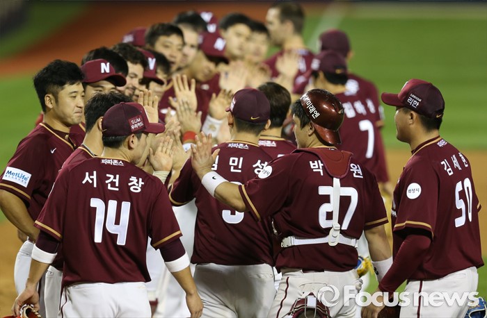 (서울=포커스뉴스) 6일 서울 잠실구장에서 열린 2016 프로야구 넥센-두산 경기에서 두산을 물리치고 6연승한 넥센 선수들이 하이파이브하고 있다.