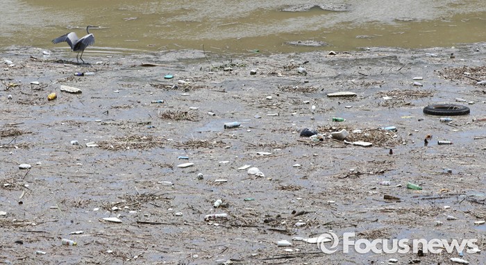 (옥천=포커스뉴스) 중부지방에 내린 집중호우로 7일 오전 충북 옥천군 군북면 대청호일대에 뒤덮힌 쓰레기 사이에 외가리 한 마리가 먹이를 찾고 있다.