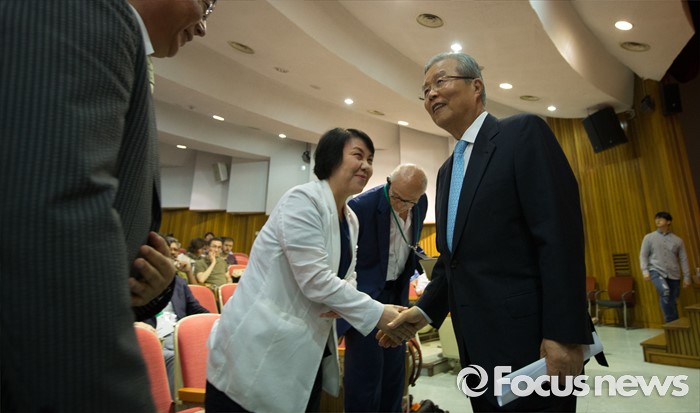 (서울=포커스뉴스) 김종인 더불어민주당 비상대책위원회 대표가 7일 오전 서울 서강대학교 다산관에서 열린 제 16차 기본소득지구네트워크 대회에서 참석자들과 인사하고 있다. 이번 16차 대회는 아시아에서는 처음 열리는 기본소득 국제 대회로 세계 23개국에서 기본소득 운동을 벌이는 활동가와 이론가들이 참석한다.