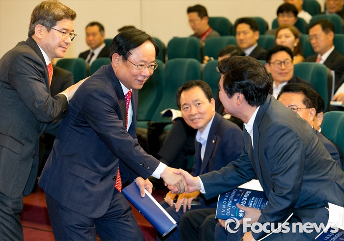 (서울=포커스뉴스) 7일 오전 서울 여의도 국회도서관에서 열린 융합혁신경제포럼 창립총회에 참석한 이주영(왼쪽 두번째) 새누리당 의원과 원유철 의원이 악수하고 있다.