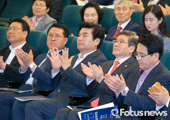 (서울=포커스뉴스) 7일 오전 서울 여의도 국회도서관에서 열린 융합혁신경제포럼 창립총회에 참석한 박맹우(앞줄 왼쪽부터), 정운천, 원유철, 김성태 새누리당 의원, 심재철 국회 부의장이 박수치고 있다.