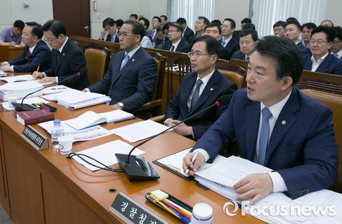 (서울=포커스뉴스) 7일 오전 서울 여의도 국회에서 열린 안전행정위원회 전체회의에 참석한 강신명(오른쪽) 경찰청장이 의원들의 질의에 답하고 있다.