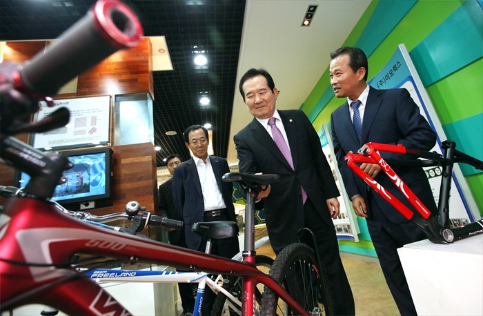 | △ 탄소소재 자전거 살펴보는 정세균 국회의장 |