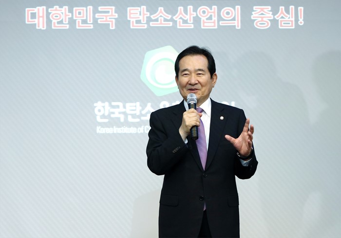 (서울=포커스뉴스) 정세균 국회의장이 7일 오후 전북 전주 한국탄소융합기술원을 방문해 인사말을 하고 있다. <사진제공=국회>