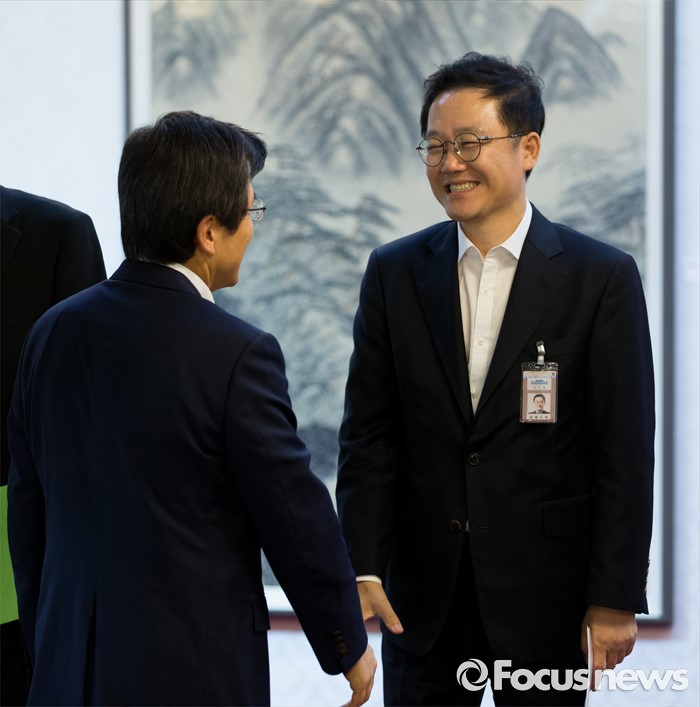 (서울=포커스뉴스) 7일 오후 서울 종로구 삼청동 국무총리공관에서 열린 당·정·청 정책조정협의회에서 황교안(왼쪽) 국무총리가 강석훈 청와대 경제수석과 인사를 나누고 있다.