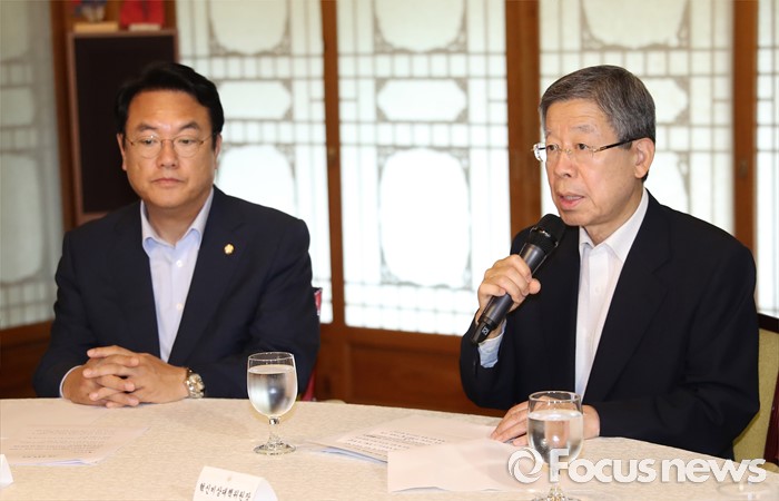 (서울=포커스뉴스) 7일 오후 서울 종로구 삼청동 국무총리공관에서 열린 당·정·청 정책조정협의회에서 김희옥(오른쪽) 새누리당 혁신비상대책위원장 모두발언을 하고 있다. 왼쪽은 정진석 새누리당 원내대표.