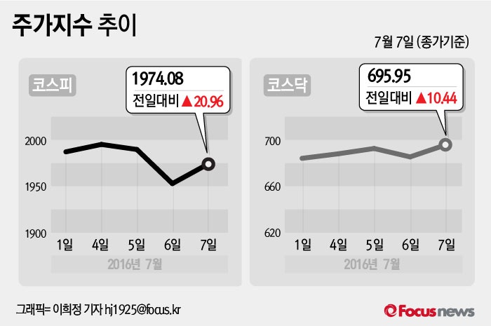 (서울=포커스뉴스) 7일 코스피지수는 전날보다 1.07%(20.96포인트) 오른 1974.08에 장을 마쳤다. 코스닥지수는 전일 대비 1.52%(10.44포인트) 오른 695.95에 마감했다.
