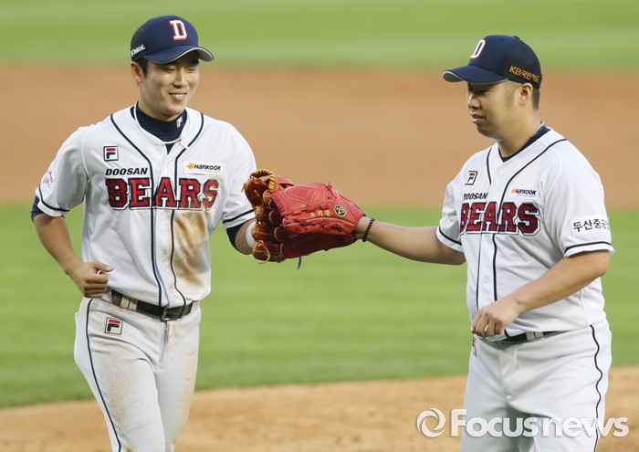 (서울=포커스뉴스) 6일 서울 잠실구장에서 열린 2016 프로야구 넥센-두산 경기에서 두산 투수 유희관이 4회 몸을 날리는 다이빙 캐치로 넥센 김민성의 타구를 잡아낸 3루수 허경민을 맞이하며 글러브를 마주치고 있다.