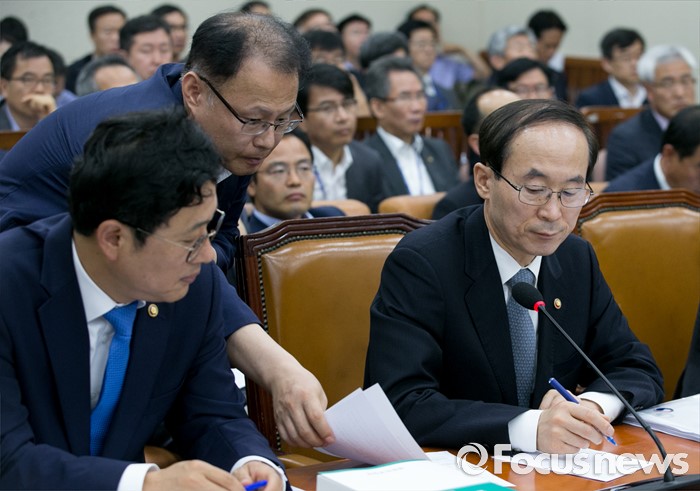 (서울=포커스뉴스) 8일 오전 서울 여의도 국회에서 열린 환경노동위원회 전체회의에 참석한 윤성규(오른쪽) 환경부 장관이 관계자로부터 자료를 받고 있다.