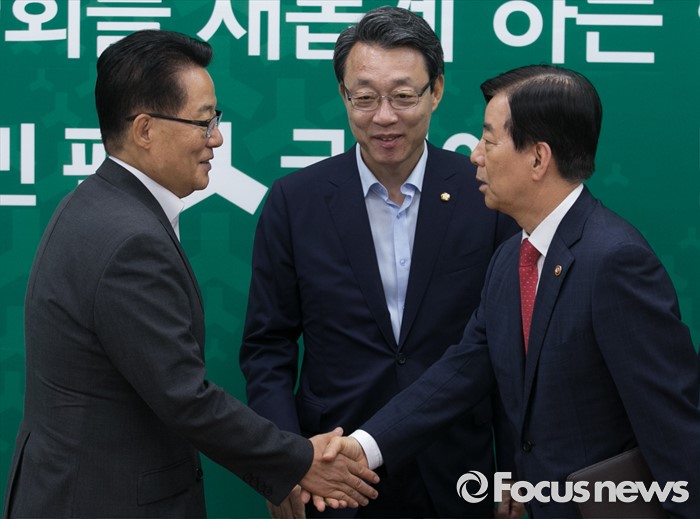 한편 앞서 한미 군 당국은 이날 오전 11시 "주한미군에 사드를 배치한다"면서 "최적의 부지 건의는 최종 준비 중에 있다"고 공식 발표했다.한민구(오른쪽) 국방부 장관이 8일 오전 서울 여의도 국회를 방문해 사드배치 등과 관련 박지원(왼쪽) 국민의당 비상대책위원장과 면담에 앞서 인사하고 있다. 가운데는 김성식 정책위의장. 2016.07.08 박동욱 기자