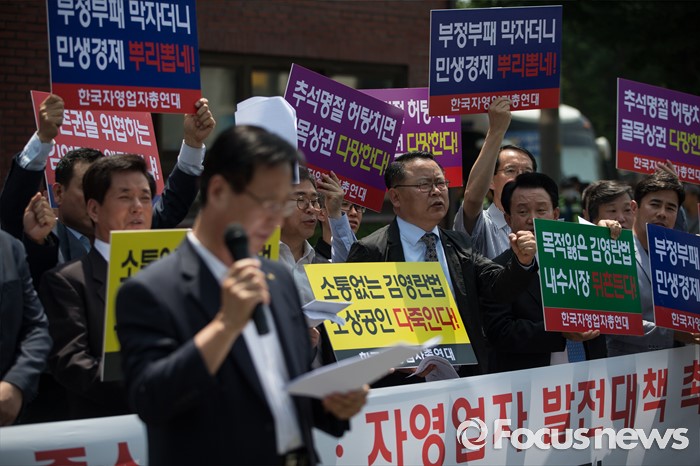 (서울=포커스뉴스) 한국자영업자총연대 등 소상공인 단체가 8일 오전 서울 종로구 효자동주민센터 앞에서 김영란법 시행 저지와 중소상공인 자영업자 발전대책 촉구 공동 기자회견을 하고 있다.