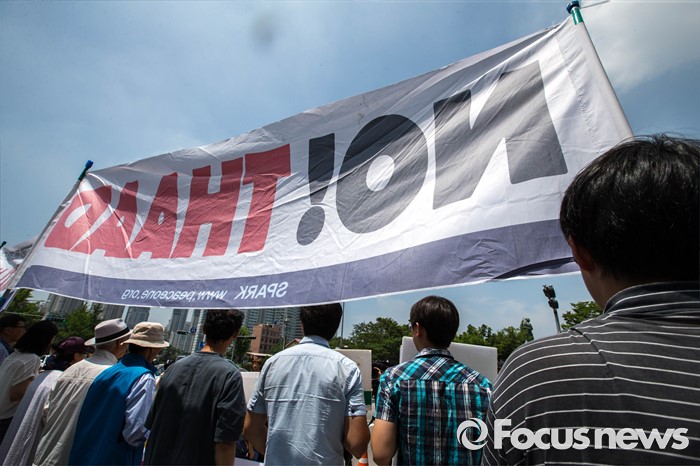 (서울=포커스뉴스) 국방부가 사드의 한국 배치를 결정한 8일 오후 서울 용산구 국방부 앞에서 사드 한국 배치를 규탄하는 평화와 통일을 여는 사람들 관계자들의 시위가 열리고 있다.