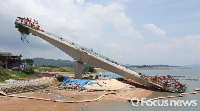 (영광=포커스뉴스) 8일 오전 전남 영광군 염산면과 무안군 해제면을 잇는 칠산대교 건설현장에서 상판 구조물이 무너져 노동자 6명이 부상을 입는 사고가 발생, 칠산대교는 가운데 교각을 중심으로 상판이 한쪽으로 기울듯 무너져 내려 있다.