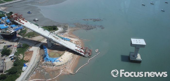 (영광=포커스뉴스) 8일 오전 전남 영광군 염산면과 무안군 해제면을 잇는 칠산대교 건설현장에서 상판 구조물이 무너져 노동자 6명이 부상을 입는 사고가 발생, 칠산대교는 가운데 교각을 중심으로 상판이 한쪽으로 기울듯 무너져 내려 있다.