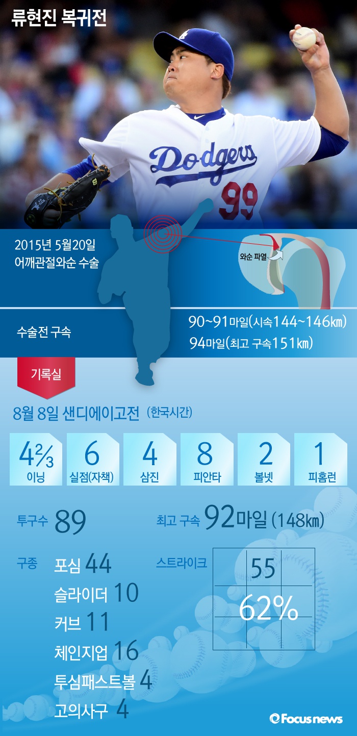 (서울=포커스뉴스) 류현진은 8일(한국시간) 미국 캘리포니아주 LA 다저스타디움에서 열린 샌디에이고와의 경기에 선발투수로 마운드에 올랐다. 류현진은 이날 4와 3분의 2이닝 4삼진 8피안타 6실점을 기록했다. 이날 최고 구속은 92마일(약 148㎞)로 수술 전 구속으로 거의 회복했다.