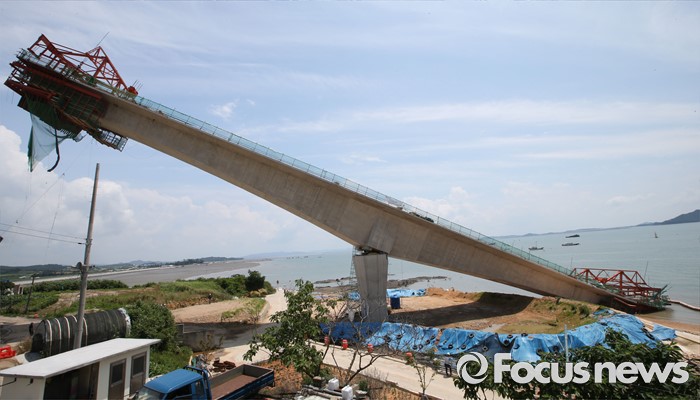 (영광=포커스뉴스) 8일 오전 전남 영광군 염산면과 무안군 해제면을 잇는 칠산대교 건설현장에서 상판 구조물이 무너져 노동자 6명이 부상을 입는 사고가 발생, 칠산대교는 가운데 교각을 중심으로 상판이 한쪽으로 기울듯 무너져 내려 있다.