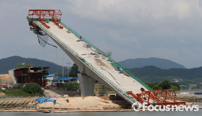 (영광=포커스뉴스) 8일 오전 전남 영광군 염산면과 무안군 해제면을 잇는 칠산대교 건설현장에서 상판 구조물이 무너져 노동자 6명이 부상을 입는 사고가 발생, 칠산대교는 가운데 교각을 중심으로 상판이 한쪽으로 기울듯 무너져 내려 있다.