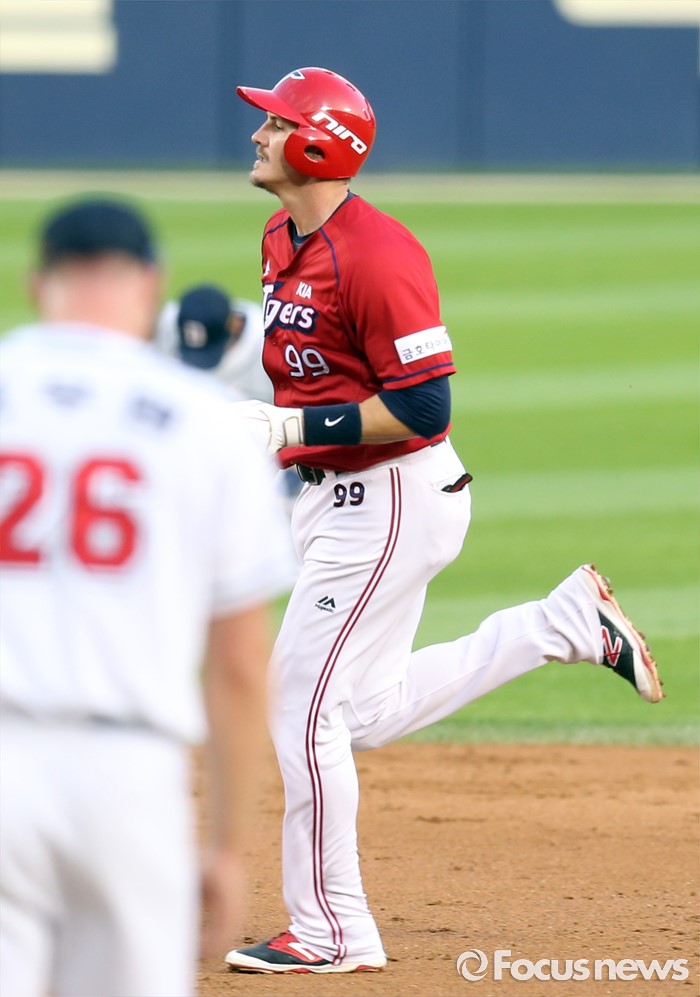 (서울=포커스뉴스) 8일 서울 잠실구장에서 열린 2016 프로야구 KIA-두산 경기 3회초 2사 1,3루에서 KIA 필이 좌월 3점 홈런을 치고 그라운드를 돌고 있다.