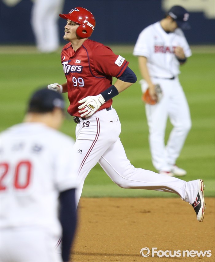 (서울=포커스뉴스) 8일 서울 잠실구장에서 열린 2016 프로야구 KIA-두산 경기 5회초 1사1루에서 KIA 필이 연타석 홈런을 치고 베이스를 돌고 있다.
