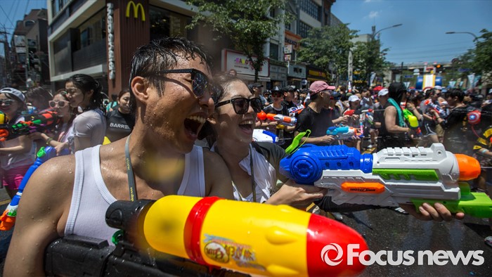 (서울=포커스뉴스) 9일 오후 서울 서대문구 신촌 연세로에서 열린 '2016 물총축제' 에 참가한 시민들이 서로 물총을 쏘며 즐거운 시간을 보내고 있다.
