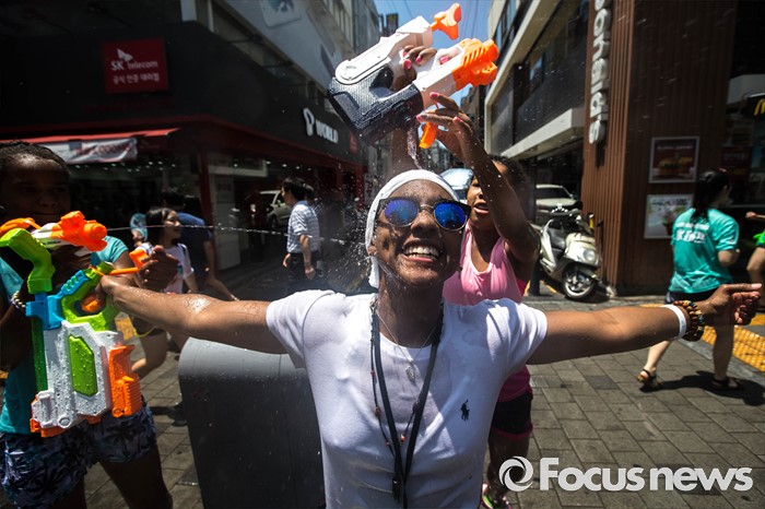 (서울=포커스뉴스) 9일 오후 서울 서대문구 신촌 연세로에서 열린 '2016 물총축제' 에 참가한 외국인들이 서로 물총을 쏘며 즐거운 시간을 보내고 있다.