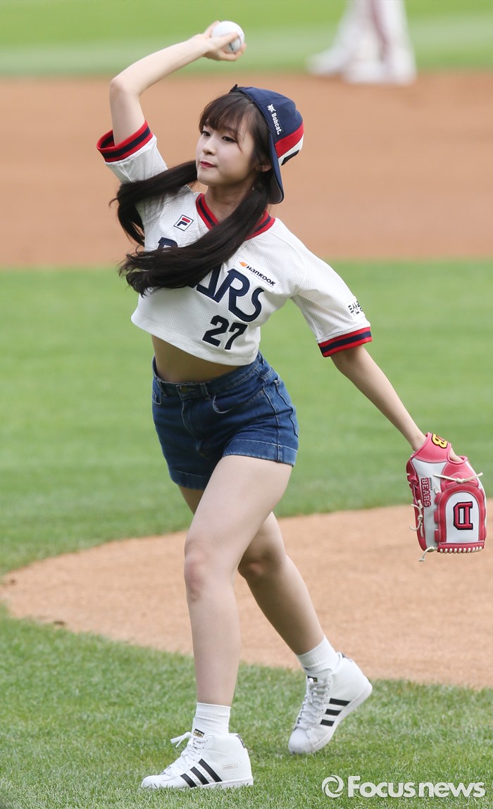 (서울=포커스뉴스) 10일 서울 잠실구장에서 열린 2016 프로야구 넥센-두산 경기에 앞서 걸그룹 '오마이걸'의 아린이 시구하고 있다.