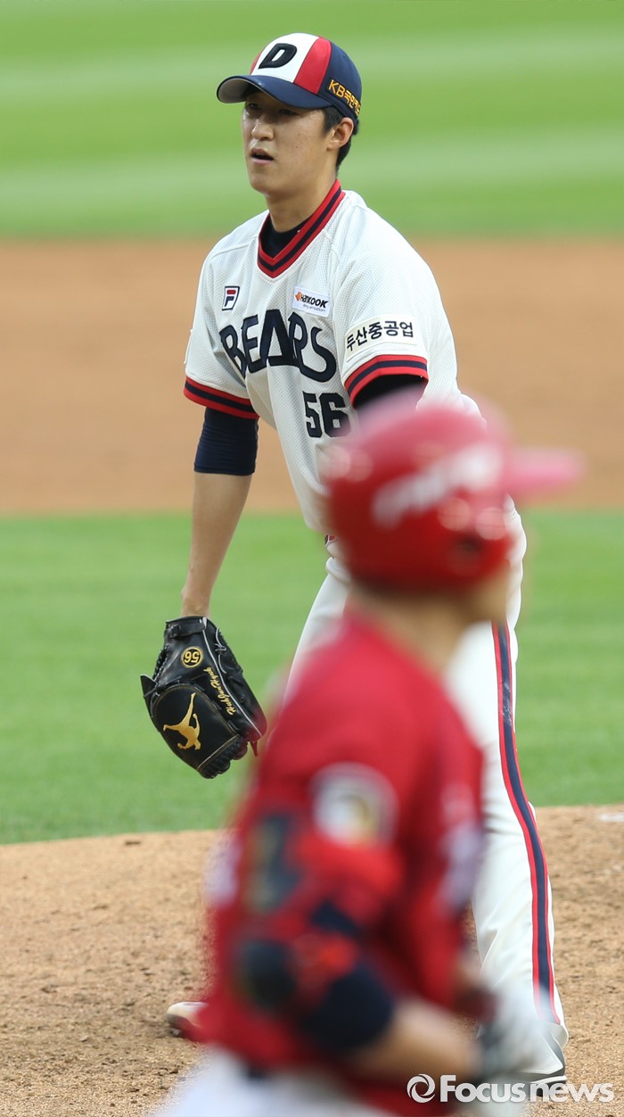 (서울=포커스뉴스) 10일 서울 잠실구장에서 열린 2016 프로야구 KIA-두산 경기 3회초 1사 1,2루에서 두산 투수 허준혁이 KIA 신종길에게 볼넷을 내주고 아쉬워하고 있다.