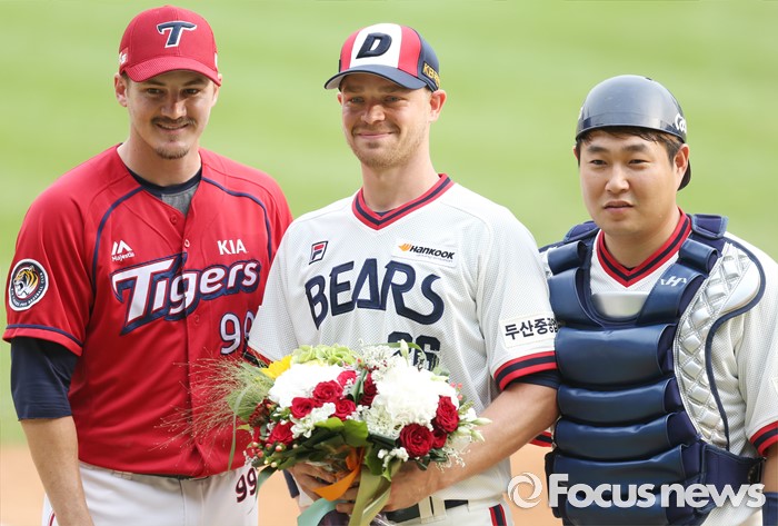 (서울=포커스뉴스) 10일 서울 잠실구장에서 열린 2016 프로야구 KIA-두산 경기에 앞서 두산 투수 보우덴의 노히트노런 시상식을 갖고 KIA 브렛 필과 두산 양의지의 축하 꽃다발을 받고 함께 기념사진을 찍고 있다.