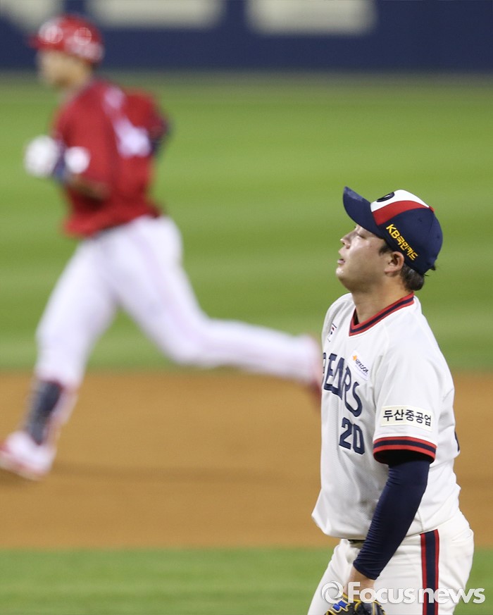 (서울=포커스뉴스) 10일 서울 잠실구장에서 열린 2016 프로야구 KIA-두산 경기 7회초 2사후 두산 투수 안규영이 KIA 서동욱에게 홈런을 허용하고 아쉬워하고 있다.