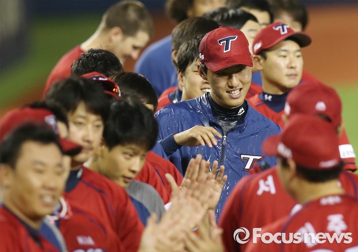 | △ 홍건희의 선발승을 축하해주는 동료들 |