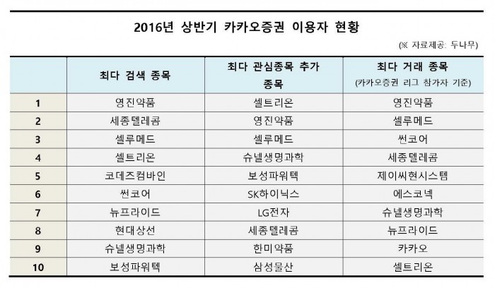 11일 카카오증권을 운영 중인 두나무(대표 송치형)에 따르면 올 상반기 카카오증권의 최다 검색 순위 1위는 영진약품, 2위 세종텔레콤, 3위 셀루메드가 차지했다. 최다 관심 종목 추가 순위로는 1위 셀트리온, 2위 영진약품, 3위 셀루메드로 나타나 전체적으로 바이오주가 강세를 보였다.
