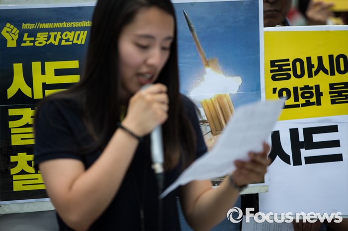 (서울=포커스뉴스) '평화와 통일을 여는 사람들' 관계자 및 사드 한국 배치를 반대하는 시민들이 11일 오전 서울 종로구 창조경제 혁신센터 앞에서 사드 한국 배치 결정 철회 촉구 기자회견을 하고 있다.