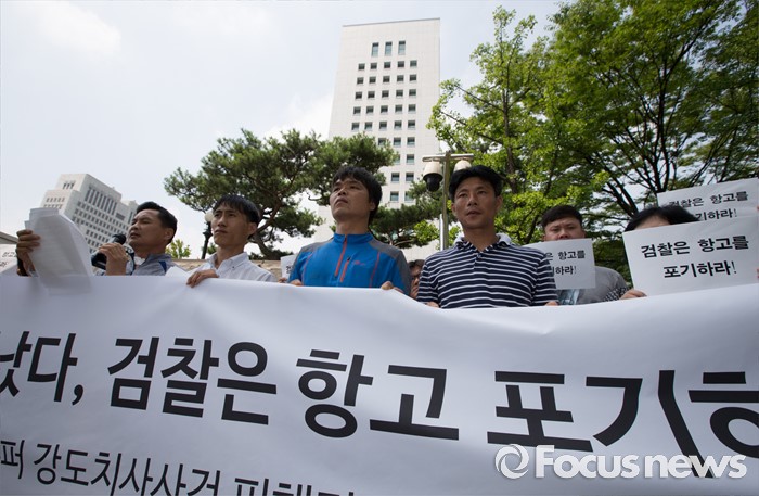 (서울=포커스뉴스) 11일 오전 서울 서초구 대검찰청 앞에서 사건의 피해자와 유가족들이 '삼례 나라슈퍼 3인조 강도치사 사건' 진정서 제출 기자회견을 하고 있다.