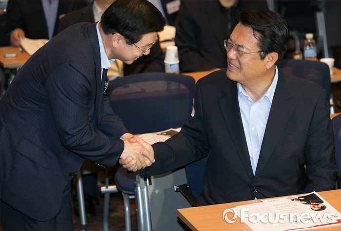(서울=포커스뉴스) 11일 오후 서울 여의도 중소기업중앙회관에서 열린 새누리당 전국원외위원장협의회 전체회의에 참석한 정진석(오른쪽) 원내대표와 박종준 세종시 위원장이 인사하고 있다.