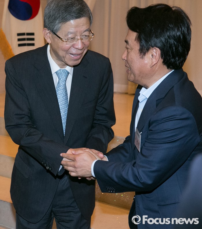 (서울=포커스뉴스) 11일 오후 서울 여의도 중소기업중앙회관에서 열린 새누리당 전국원외위원장협의회 전체회의에 참석한 김희옥(왼쪽) 혁신비대위원장과 이성헌 전국원외위원장협의회장이 기념촬영 후 악수하고 있다.