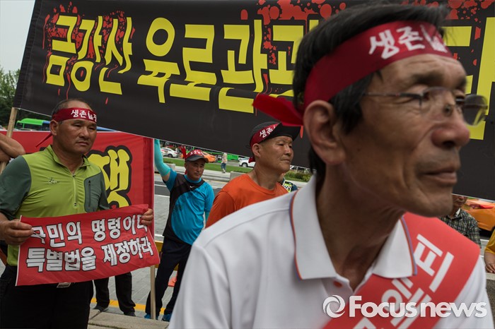 (서울=포커스뉴스) 금강산관광 중단 8년째를 맞아 금강산관광 중단 피해대응 고성군 추진위원회 회원들이 11일 오후 서울 종로구 서울정부청사앞에서 지원대책 마련을 촉구하며 집회를 갖고 있다.