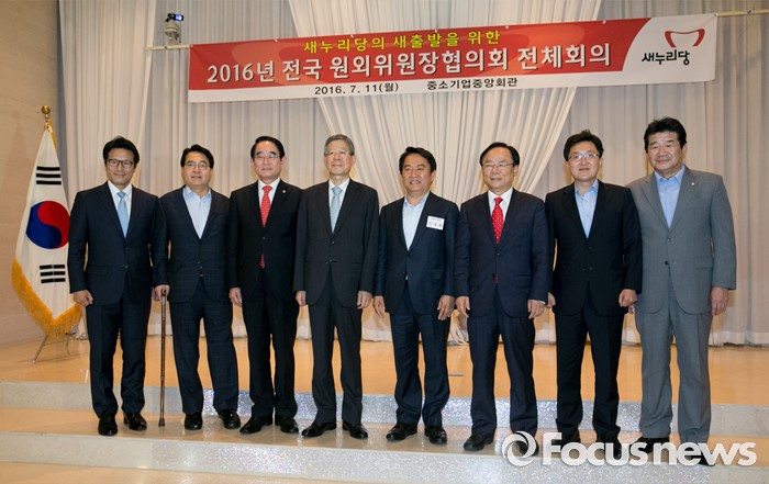 (서울=포커스뉴스) 11일 오후 서울 여의도 중소기업중앙회관에서 열린 새누리당 전국원외위원장협의회 전체회의에 참석한 지도부와 전당대회 출마자 등이 취재진을 향해 포즈를 취하고 있다. 왼쪽부터 정병국 의원, 심재철 국회 부의장, 박명재 사무총장, 김희옥 혁신비대위원장, 이성헌 전국원외위원장협의회장, 이주영, 김용태, 강석호 의원.