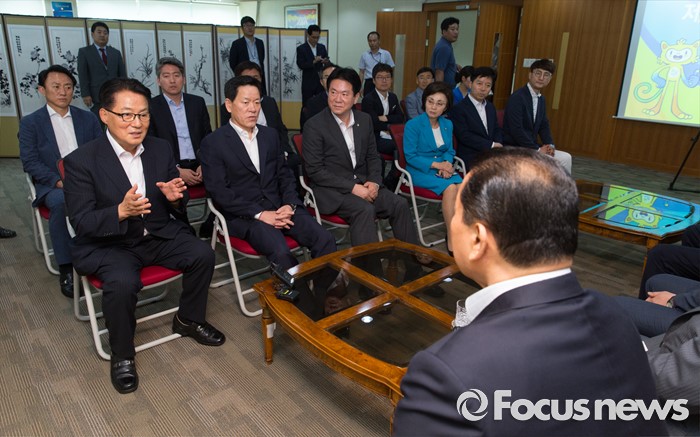 (서울=포커스뉴스) 박지원(왼쪽 두번째) 국민의당 비상대책위원장을 비롯한 주요 당직자들이 11일 오후 서울 노원구 태릉선수촌에 방문해 김정행 대한체육회 공동회장 등 참석자들과 대화 나누고 있다.